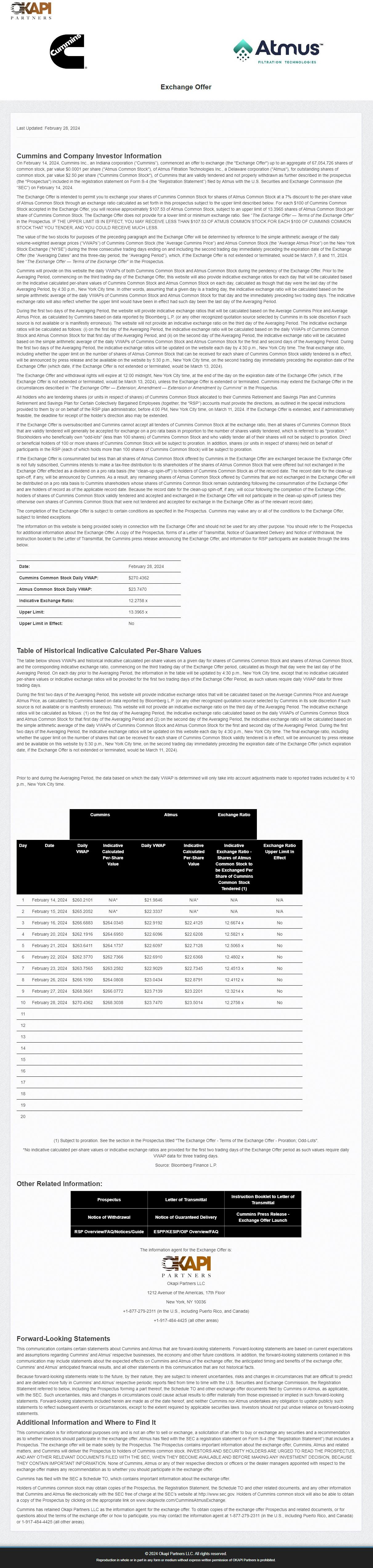 l' ,\RTNERS Last Updated: February 14, 2024 Cummins and Company Investor Information ~ Atmus- ••• •• FILTRATION TECHNOLOGIES On February 14, 2024, Cummins Inc, an Indiana corporation ('Cummins"), commenced an offer to exchange (the "Exchange Oller') up to an aggregate of 67,054,726 shares of common stock, par value $0.0001 per share ("Atmus Common Stock"), of Atmus Filtratirn Technologies Inc., a Delaware corpora tion ("Atmus"), for ou tstanding shares of common stock, par value $2.50 per share ("Cummins Common Stock'' ), of Cummins that are validly tendered and not properly withdrawn as further described in the prospectus (117e "Prospectus") included in the registration statement on Form S-4 (the "Registration Statement") fi lel:l by Atmus with the U s Securities and Exchange Commission (the ' SEC") on February 14, 2024 The Exchange Offer is intended to permit you to exchange your shares of Cummins Common Stock for shares of Atmus Common Stock at a 7% discount to the per-share value of Atmus Common Stock through an exchange ratio calcu lated as set forth in this prospectus subject to the upper limit describel:l below. For each $100 of Cummins Common Stock acceptel:l in the Exchange Offer, you will receive approximately $107.53 of Atmus Common Stock, subject to an upper limit of 13.3965 shares of At mus Common Stock per share of Cummins Common Stock. The Exchange Offer does not provide for a lower limit or minimum exchange ratio. See "The Exchange Offer - Terms of/he Exchange Offer" in the Prospectus. IFTHE UPPER LIMIT IS IN EFFECT, YOU MAY RECEIVE LESS THAN $107.53 OF ATM US COMMON STOCK FOR EACH S100 OF CUMMINS COMMON STOCK THAT YOU TENDER, AND YOU COULD RECEIVE MUCH LESS The value of the two stocks for purposes of the preceding paragraph and the Exchange Offer will be determined by reference to the simple arithme tic average of the daily volume-weigh ted average prices CVWAPs") of Cummins Common Stock (the "Average Cummins Price") and Atmus Com mm Stock (117e "Average Atmus Price") on the New York Stock Exchange ("NYSE") during the three consecutive trading days ending on and including the second trading day immediately preceding the expiration date of the Exchange Offer (the "Averaging Dates· and th is three-day period, the "Averaging Period"), which, if the Exchange Offer is not extended or terminated, would be March 7, 8 and 11 2024 See "The Exchange Offer - Terms of the Exchange Offer" in the Prospectus Cummins will provide on th is website the daily VWAPs of both Cummins Common Stock and Atmus Common Stock during the pendency of the Exchange Offer. Prior to the Averaging Period, commencing on the third trad ing day of the Exchange Oller, this website will also provide indicative exchange ratios for each day that will be calculated based on the indicative calculated per-share values of Cummins Common Stock and Atmus Common Stock on each day, calculated as though that day were the last day of the Averaging Period, by 4 30 p.m., New York City time. In other words. assuming that a given day is a trading day, the indicative exchange ratio will be calculated based on the simple arithmetic average of the daily VWAPs of Cummins Common Stock and Atmus Common Stock for that day and the immediately preceding two trading days The indicative exchange ratio will also reflect whether the upper limit would have been in effect had such day been the last day of the Averaging Period During the fi rst two days of the Averaging Period, the website will provide indicative exchange ratios that will be calculated based on the Average Cummins Price and Average Atmus Price, as calculated by Cummins based on data reported by Bloomberg L.P (or any other recognized quotation source selected by Cummins in its sole discretion if such source is not available or is manifestly erroneous). The website will not provide an indicative exchange ratio on the third day of the Averaging Period . The indicative exchange ratios will be calculated as follows: (i) on the fi rst day of 117eAveraging Period, the indica tive exchange ratio will be calculated based on the daily VWAPs of Cummins Common Stock and Atmus Common Stock for that first day of the Averaging Period, and (ii) on the second day of the Averaging Period, the indicative exchange ratio will be calculated based on the simple arithmetic average of the daily VWAPs of Cummins Common Stock and Atmus Common Stock for the first and second days of the Averaging Period. During the first two days of the Averaging Period, the indicative exchange ratios wil l be updatel:l on the websi te each day by 4:30 p.m. , New York City time. The final exchange ratio including whether the upper limit on the number of shares of Atmus Common Stock that can be received for each share of Cummins Common Stock validly tenderel:l is in effect, will be announced by press release and be available on the website by 5:30 p.m New York City time, on the second trading day immediately preceding the expira tion date of the Exchange Offer (which date, if the Exchange Offer is not extended or terminated. would be March 13. 2024) The Exchange Offer and withdrawal rights wil l expire at 12 00 midnight, New York City time, at the end of the day on the expiration date of the Exchange Oller (which, if the Exchange Offer is not extended or terminated, would be March 13, 2024), unless the Exchange Oller is extendel:l or terminated. Cummins may extend the Exchange Offer in the circumstances described in "The Exchange Offer - Ex/ens/on; Amendment - Extension or Amendment by Cummins" in the Prospectus All holders who are tendering shares (or units in respect of shares) of Cummins Common Stock allocated to their Cummins Retirement and Savings Plan and Cummins Retirement and Savings Plan for Certain Collective ly Bargained Employees (together, the "RSP") accounts must provide the directions, as outlined in the special instructions provided to them by or on behalf of the RSP plan administrator, before 4