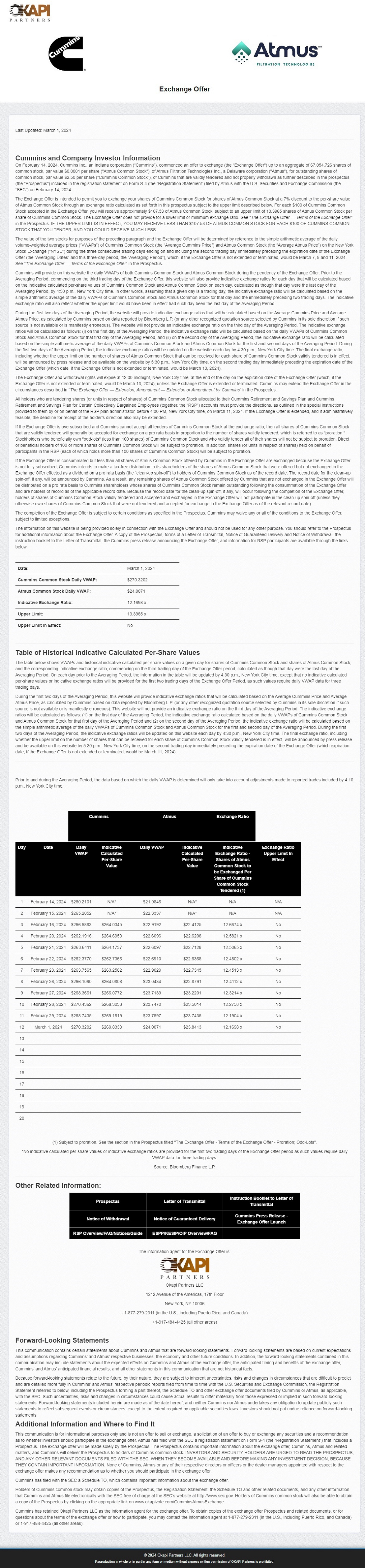 l' ,\RTNERS Last Updated: February 14, 2024 Cummins and Company Investor Information ~ Atmus- ••• •• FILTRATION TECHNOLOGIES On February 14, 2024, Cummins Inc, an Indiana corporation ('Cummins"), commenced an offer to exchange (the "Exchange Oller') up to an aggregate of 67,054,726 shares of common stock, par value $0.0001 per share ("Atmus Common Stock"), of Atmus Filtratirn Technologies Inc., a Delaware corpora tion ("Atmus"), for ou tstanding shares of common stock, par value $2.50 per share ("Cummins Common Stock'' ), of Cummins that are validly tendered and not properly withdrawn as further described in the prospectus (117e "Prospectus") included in the registration statement on Form S-4 (the "Registration Statement") fi lel:l by Atmus with the U s Securities and Exchange Commission (the ' SEC") on February 14, 2024 The Exchange Offer is intended to permit you to exchange your shares of Cummins Common Stock for shares of Atmus Common Stock at a 7% discount to the per-share value of Atmus Common Stock through an exchange ratio calcu lated as set forth in this prospectus subject to the upper limit describel:l below. For each $100 of Cummins Common Stock acceptel:l in the Exchange Offer, you will receive approximately $107.53 of Atmus Common Stock, subject to an upper limit of 13.3965 shares of At mus Common Stock per share of Cummins Common Stock. The Exchange Offer does not provide for a lower limit or minimum exchange ratio. See "The Exchange Offer - Terms of/he Exchange Offer" in the Prospectus. IFTHE UPPER LIMIT IS IN EFFECT, YOU MAY RECEIVE LESS THAN $107.53 OF ATM US COMMON STOCK FOR EACH S100 OF CUMMINS COMMON STOCK THAT YOU TENDER, AND YOU COULD RECEIVE MUCH LESS The value of the two stocks for purposes of the preceding paragraph and the Exchange Offer will be determined by reference to the simple arithme tic average of the daily volume-weigh ted average prices CVWAPs") of Cummins Common Stock (the "Average Cummins Price") and Atmus Com mm Stock (117e "Average Atmus Price") on the New York Stock Exchange ("NYSE") during the three consecutive trading days ending on and including the second trading day immediately preceding the expiration date of the Exchange Offer (the "Averaging Dates· and th is three-day period, the "Averaging Period"), which, if the Exchange Offer is not extended or terminated, would be March 7, 8 and 11 2024 See "The Exchange Offer - Terms of the Exchange Offer" in the Prospectus Cummins will provide on th is website the daily VWAPs of both Cummins Common Stock and Atmus Common Stock during the pendency of the Exchange Offer. Prior to the Averaging Period, commencing on the third trad ing day of the Exchange Oller, this website will also provide indicative exchange ratios for each day that will be calculated based on the indicative calculated per-share values of Cummins Common Stock and Atmus Common Stock on each day, calculated as though that day were the last day of the Averaging Period, by 4 30 p.m., New York City time. In other words. assuming that a given day is a trading day, the indicative exchange ratio will be calculated based on the simple arithmetic average of the daily VWAPs of Cummins Common Stock and Atmus Common Stock for that day and the immediately preceding two trading days The indicative exchange ratio will also reflect whether the upper limit would have been in effect had such day been the last day of the Averaging Period During the fi rst two days of the Averaging Period, the website will provide indicative exchange ratios that will be calculated based on the Average Cummins Price and Average Atmus Price, as calculated by Cummins based on data reported by Bloomberg L.P (or any other recognized quotation source selected by Cummins in its sole discretion if such source is not available or is manifestly erroneous). The website will not provide an indicative exchange ratio on the third day of the Averaging Period . The indicative exchange ratios will be calculated as follows: (i) on the fi rst day of 117eAveraging Period, the indica tive exchange ratio will be calculated based on the daily VWAPs of Cummins Common Stock and Atmus Common Stock for that first day of the Averaging Period, and (ii) on the second day of the Averaging Period, the indicative exchange ratio will be calculated based on the simple arithmetic average of the daily VWAPs of Cummins Common Stock and Atmus Common Stock for the first and second days of the Averaging Period. During the first two days of the Averaging Period, the indicative exchange ratios wil l be updatel:l on the websi te each day by 4:30 p.m. , New York City time. The final exchange ratio including whether the upper limit on the number of shares of Atmus Common Stock that can be received for each share of Cummins Common Stock validly tenderel:l is in effect, will be announced by press release and be available on the website by 5:30 p.m New York City time, on the second trading day immediately preceding the expira tion date of the Exchange Offer (which date, if the Exchange Offer is not extended or terminated. would be March 13. 2024) The Exchange Offer and withdrawal rights wil l expire at 12 00 midnight, New York City time, at the end of the day on the expiration date of the Exchange Oller (which, if the Exchange Offer is not extended or terminated, would be March 13, 2024), unless the Exchange Oller is extendel:l or terminated. Cummins may extend the Exchange Offer in the circumstances described in "The Exchange Offer - Ex/ens/on; Amendment - Extension or Amendment by Cummins" in the Prospectus All holders who are tendering shares (or units in respect of shares) of Cummins Common Stock allocated to their Cummins Retirement and Savings Plan and Cummins Retirement and Savings Plan for Certain Collective ly Bargained Employees (together, the "RSP") accounts must provide the directions, as outlined in the special instructions provided to them by or on behalf of the RSP plan administrator, before 4