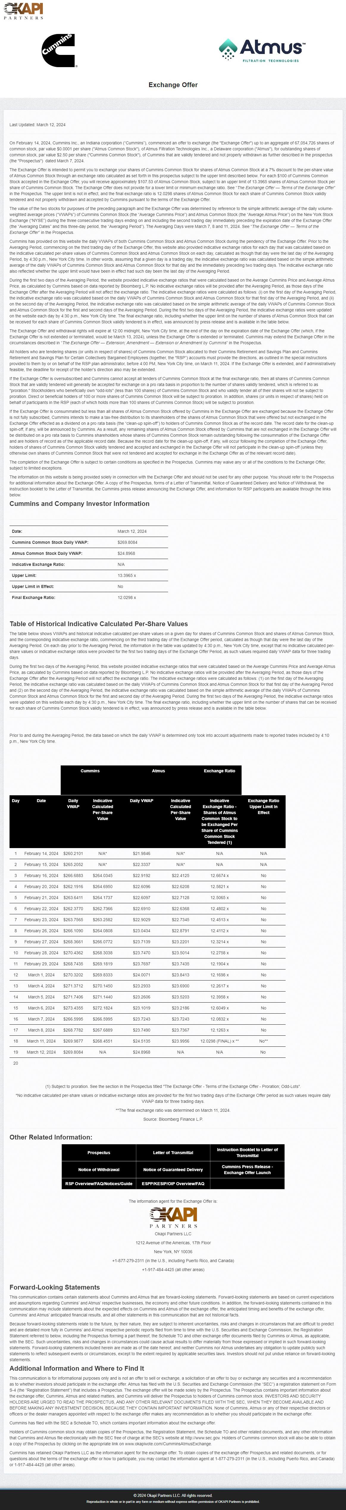 l' ,\RTNERS Last Updated: February 14, 2024 Cummins and Company Investor Information ~ Atmus- ••• •• FILTRATION TECHNOLOGIES On February 14, 2024, Cummins Inc, an Indiana corporation ('Cummins"), commenced an offer to exchange (the "Exchange Oller') up to an aggregate of 67,054,726 shares of common stock, par value $0.0001 per share ("Atmus Common Stock"), of Atmus Filtratirn Technologies Inc., a Delaware corpora tion ("Atmus"), for ou tstanding shares of common stock, par value $2.50 per share ("Cummins Common Stock'' ), of Cummins that are validly tendered and not properly withdrawn as further described in the prospectus (117e "Prospectus") included in the registration statement on Form S-4 (the "Registration Statement") fi lel:l by Atmus with the U s Securities and Exchange Commission (the ' SEC") on February 14, 2024 The Exchange Offer is intended to permit you to exchange your shares of Cummins Common Stock for shares of Atmus Common Stock at a 7% discount to the per-share value of Atmus Common Stock through an exchange ratio calcu lated as set forth in this prospectus subject to the upper limit describel:l below. For each $100 of Cummins Common Stock acceptel:l in the Exchange Offer, you will receive approximately $107.53 of Atmus Common Stock, subject to an upper limit of 13.3965 shares of At mus Common Stock per share of Cummins Common Stock. The Exchange Offer does not provide for a lower limit or minimum exchange ratio. See "The Exchange Offer - Terms of/he Exchange Offer" in the Prospectus. IFTHE UPPER LIMIT IS IN EFFECT, YOU MAY RECEIVE LESS THAN $107.53 OF ATM US COMMON STOCK FOR EACH S100 OF CUMMINS COMMON STOCK THAT YOU TENDER, AND YOU COULD RECEIVE MUCH LESS The value of the two stocks for purposes of the preceding paragraph and the Exchange Offer will be determined by reference to the simple arithme tic average of the daily volume-weigh ted average prices CVWAPs") of Cummins Common Stock (the "Average Cummins Price") and Atmus Com mm Stock (117e "Average Atmus Price") on the New York Stock Exchange ("NYSE") during the three consecutive trading days ending on and including the second trading day immediately preceding the expiration date of the Exchange Offer (the "Averaging Dates· and th is three-day period, the "Averaging Period"), which, if the Exchange Offer is not extended or terminated, would be March 7, 8 and 11 2024 See "The Exchange Offer - Terms of the Exchange Offer" in the Prospectus Cummins will provide on th is website the daily VWAPs of both Cummins Common Stock and Atmus Common Stock during the pendency of the Exchange Offer. Prior to the Averaging Period, commencing on the third trad ing day of the Exchange Oller, this website will also provide indicative exchange ratios for each day that will be calculated based on the indicative calculated per-share values of Cummins Common Stock and Atmus Common Stock on each day, calculated as though that day were the last day of the Averaging Period, by 4 30 p.m., New York City time. In other words. assuming that a given day is a trading day, the indicative exchange ratio will be calculated based on the simple arithmetic average of the daily VWAPs of Cummins Common Stock and Atmus Common Stock for that day and the immediately preceding two trading days The indicative exchange ratio will also reflect whether the upper limit would have been in effect had such day been the last day of the Averaging Period During the fi rst two days of the Averaging Period, the website will provide indicative exchange ratios that will be calculated based on the Average Cummins Price and Average Atmus Price, as calculated by Cummins based on data reported by Bloomberg L.P (or any other recognized quotation source selected by Cummins in its sole discretion if such source is not available or is manifestly erroneous). The website will not provide an indicative exchange ratio on the third day of the Averaging Period . The indicative exchange ratios will be calculated as follows: (i) on the fi rst day of 117eAveraging Period, the indica tive exchange ratio will be calculated based on the daily VWAPs of Cummins Common Stock and Atmus Common Stock for that first day of the Averaging Period, and (ii) on the second day of the Averaging Period, the indicative exchange ratio will be calculated based on the simple arithmetic average of the daily VWAPs of Cummins Common Stock and Atmus Common Stock for the first and second days of the Averaging Period. During the first two days of the Averaging Period, the indicative exchange ratios wil l be updatel:l on the websi te each day by 4:30 p.m. , New York City time. The final exchange ratio including whether the upper limit on the number of shares of Atmus Common Stock that can be received for each share of Cummins Common Stock validly tenderel:l is in effect, will be announced by press release and be available on the website by 5:30 p.m New York City time, on the second trading day immediately preceding the expira tion date of the Exchange Offer (which date, if the Exchange Offer is not extended or terminated. would be March 13. 2024) The Exchange Offer and withdrawal rights wil l expire at 12 00 midnight, New York City time, at the end of the day on the expiration date of the Exchange Oller (which, if the Exchange Offer is not extended or terminated, would be March 13, 2024), unless the Exchange Oller is extendel:l or terminated. Cummins may extend the Exchange Offer in the circumstances described in "The Exchange Offer - Ex/ens/on; Amendment - Extension or Amendment by Cummins" in the Prospectus All holders who are tendering shares (or units in respect of shares) of Cummins Common Stock allocated to their Cummins Retirement and Savings Plan and Cummins Retirement and Savings Plan for Certain Collective ly Bargained Employees (together, the "RSP") accounts must provide the directions, as outlined in the special instructions provided to them by or on behalf of the RSP plan administrator, before 4